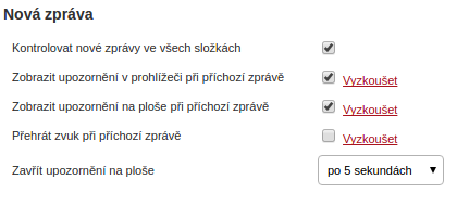 - upozornění na nově příchozí email - na nově přijatý email je možné nově upozornit zvukovým upozorněním či zobrazením upozornění. Uvedená funkce se nastavuje v "Nastavení -> Zobrazení schránky -> Zobrazit upozornění v prohlížeči při příchozí zprávě či Zobrazit upozornění na ploše při příchozí zprávě". Kliknutím na vyzkoušet je možné zobrazit zkušební upozornění.