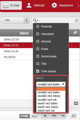 - vyhledávání ve složkách je možné i podle stáří emailu - nyní je možné hledat zprávy novější nebo starší než týden, měsíc či rok